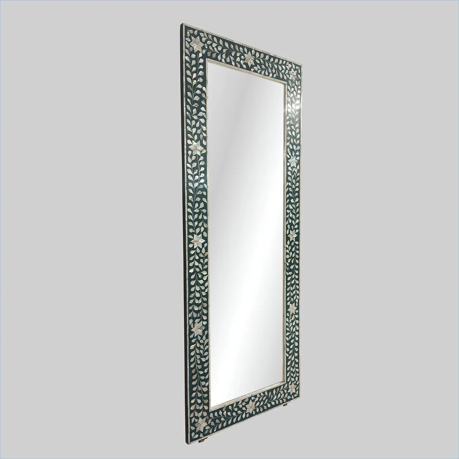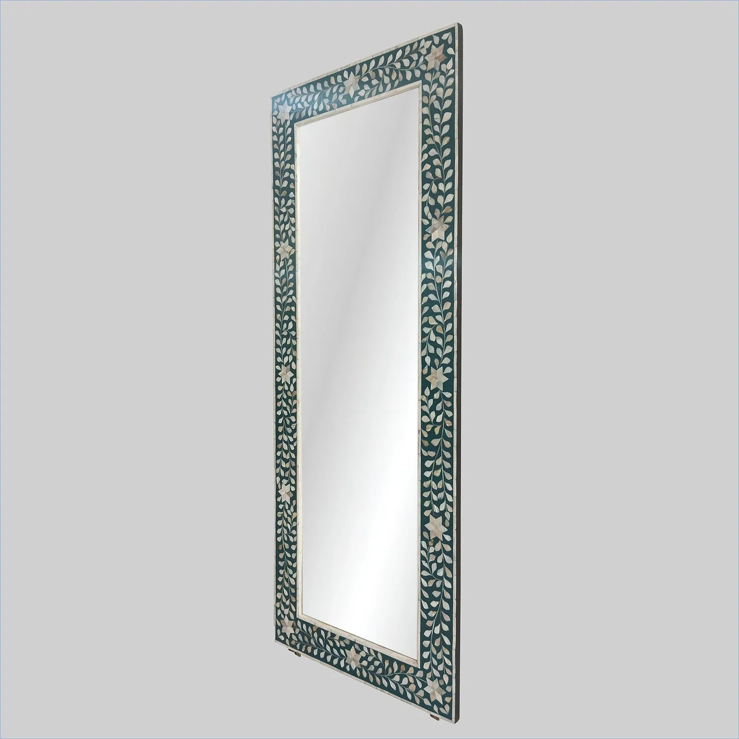 A stunning floor mirror featuring a floral bone inlay design on an MDF base, adding elegance to any space. Its vibrant turquoise hue makes it a statement piece for your home. This mirror not only serves a functional purpose but also brings a refreshing charm to bedrooms, dressing areas, or entryways.