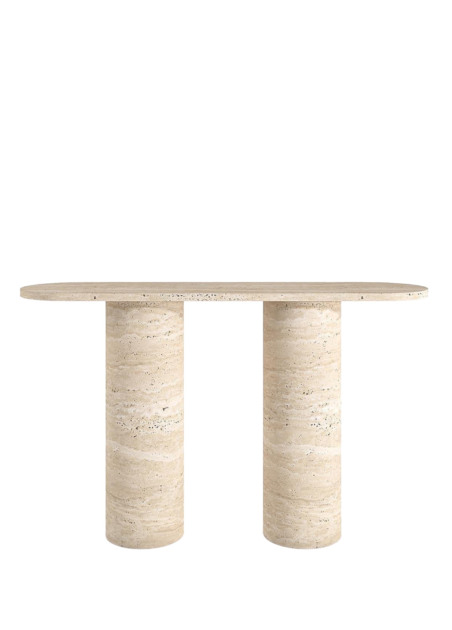 A console table crafted from natural travertine, featuring two striking cylindrical legs. Its minimalist yet timeless design makes it a perfect addition to entryways, living rooms, or hallways, adding warmth and elegance to any space.