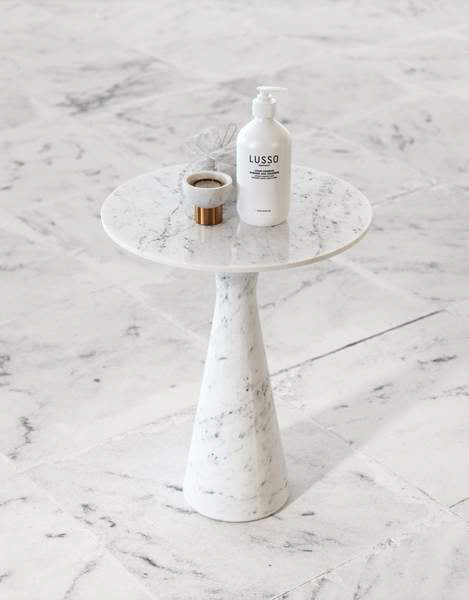 "Kao" End Table, crafted from exquisite White marble. With its pristine white color adorned with subtle hints of black veining, this end table is a beautiful and minimalistic piece that radiates sophistication. The sleek design adds to its allure, making it a perfect addition for those seeking a blend of beauty and simplicity.