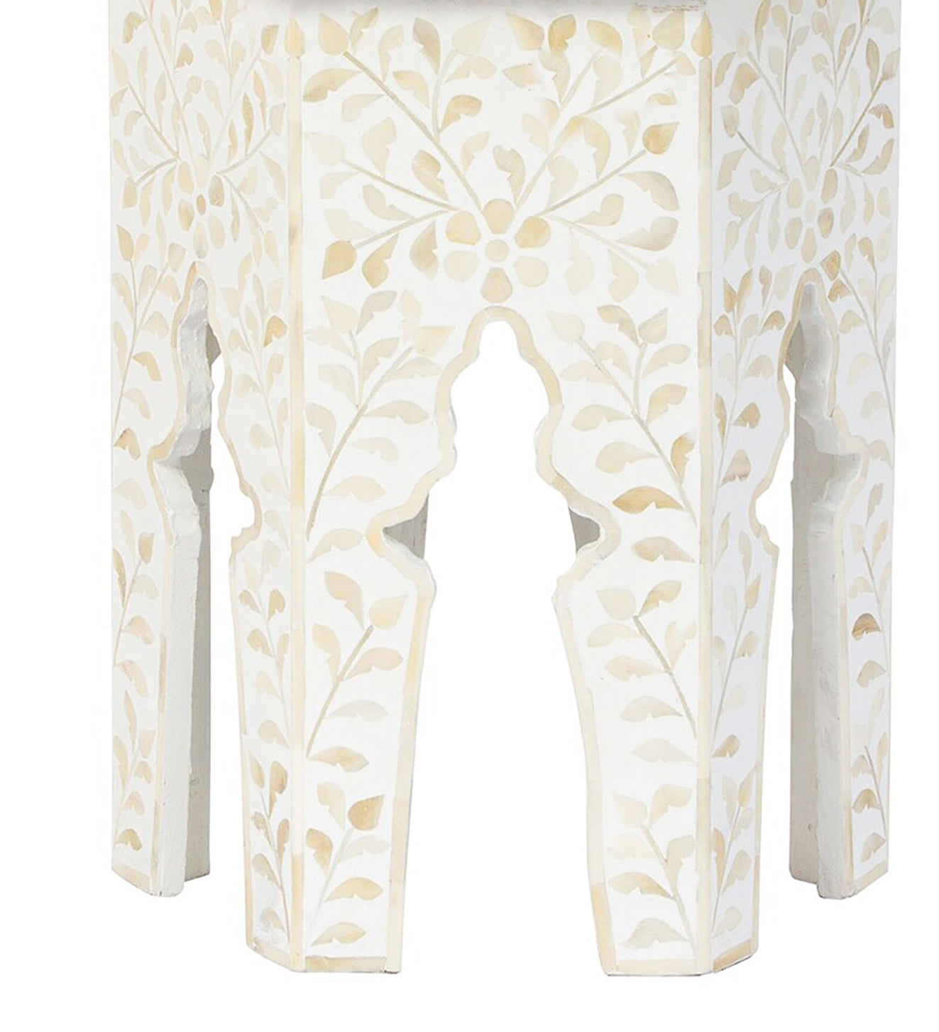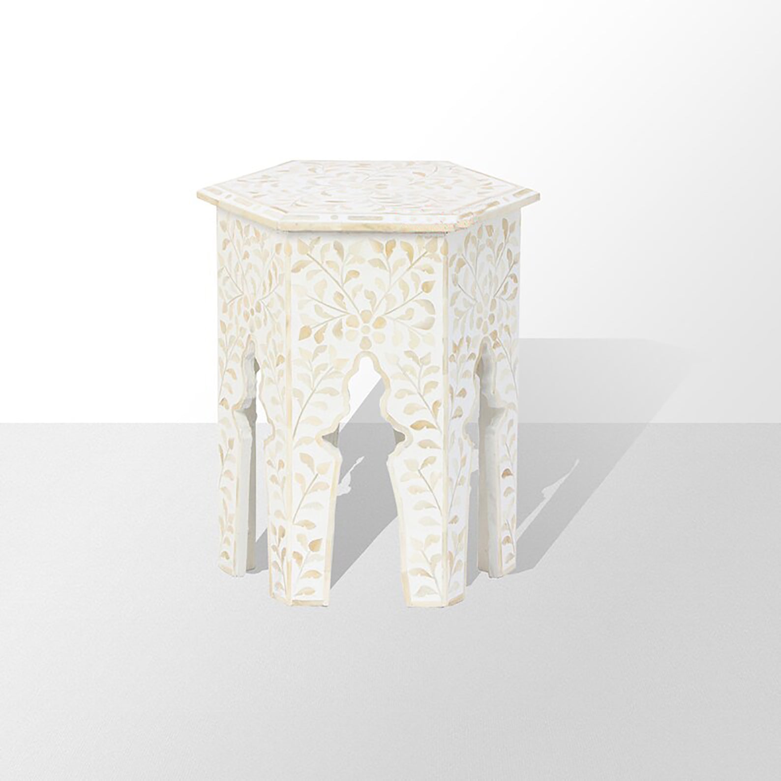 Floral Maisy – a delicate masterpiece in white. Crafted from exquisite mother of pearl, its compact design and intricate floral patterns make it a functional and charming addition to any space. Elevate your decor with the timeless elegance of our Floral Pearl Stool.